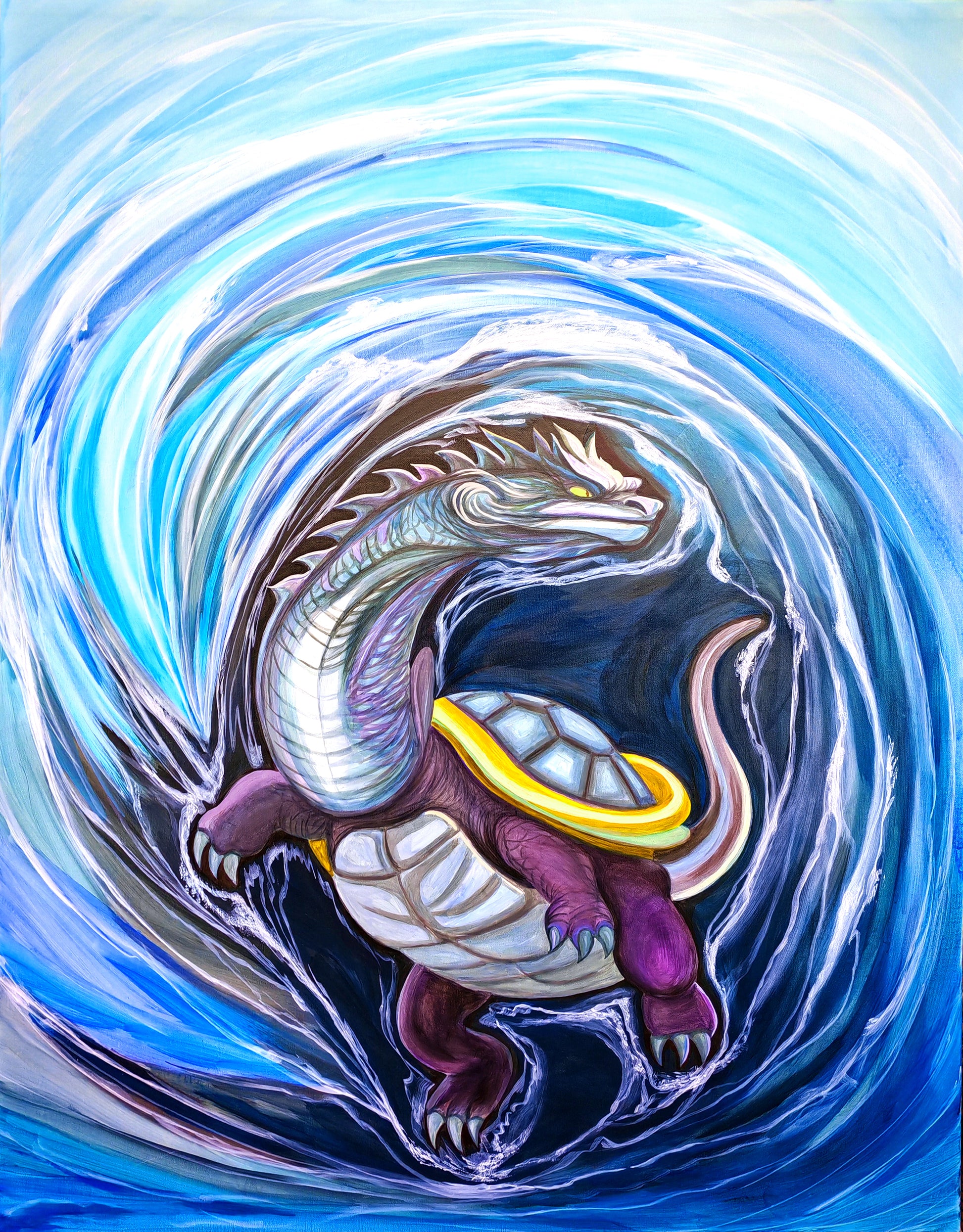 画作以水墨氤氲喻玄德之包容,漩涡流转显共生之智慧,恰如《道德经》所言“上善若水”,玄武于深海旋涡中,演绎着道法自然、生生不息的东方哲学。暗合“玄德”之真意:不争而万物归,不言而天下应。