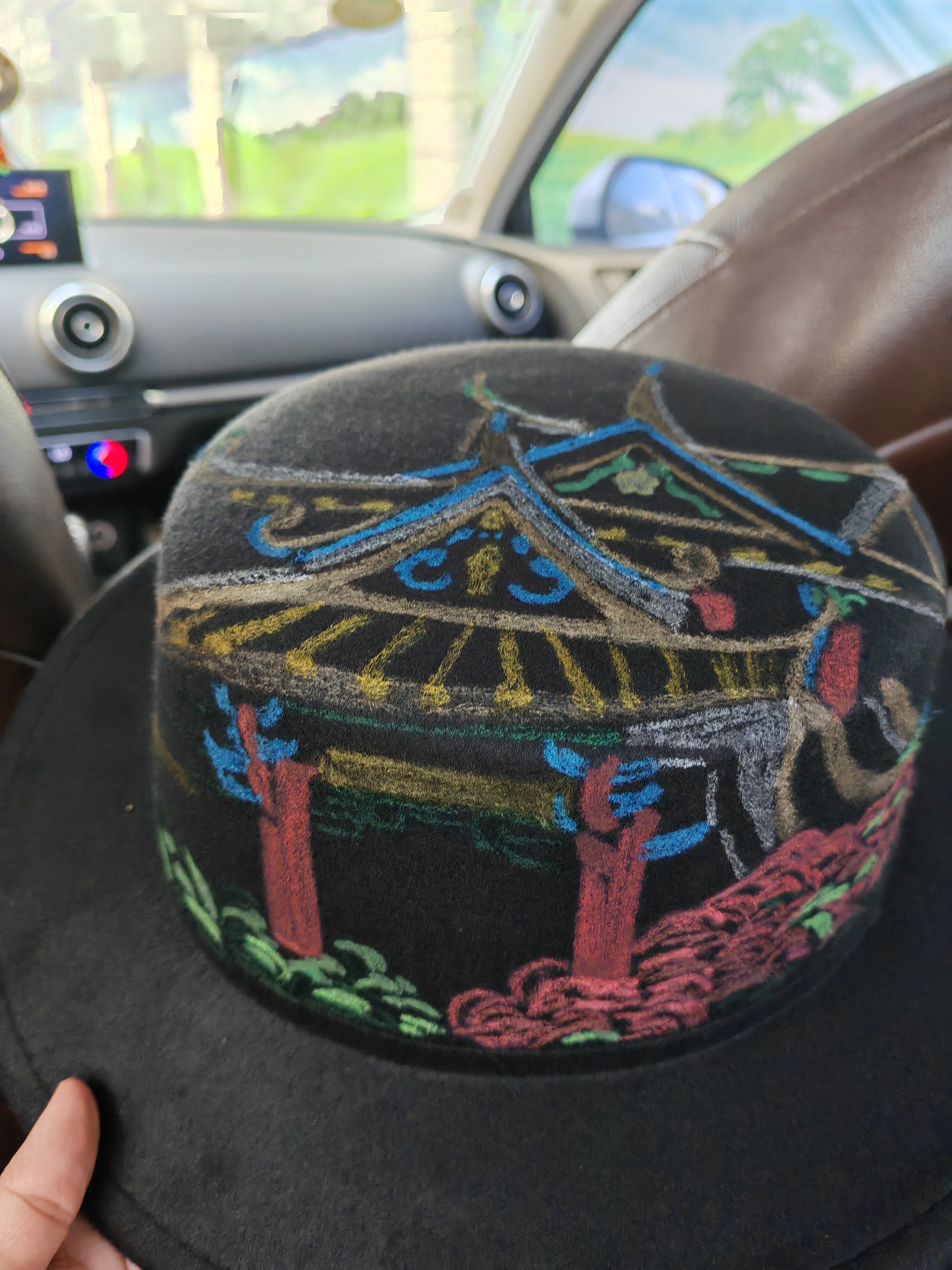 在绘画手法上,设计师采用了细腻而富有层次感的线条与色彩,将亭子的琉璃瓦顶、廊庑、亭榭等细节一一呈现。色彩运用上,设计以闽南建筑常用的红、黄、蓝等鲜艳色彩为主,搭配以金色的琉璃瓦顶,使得整个画面既富有活力又不失庄重。 \n \n同时,设计师还巧妙地运用了简约的构成,使得帽子上的绘画更加立体而生动,仿佛每一个细节都在讲述着龙舟池畔的故事,这一设计不仅是对集美龙舟池美景的精致再现,更是对闽南文化与东南亚风情交融的独特诠释。