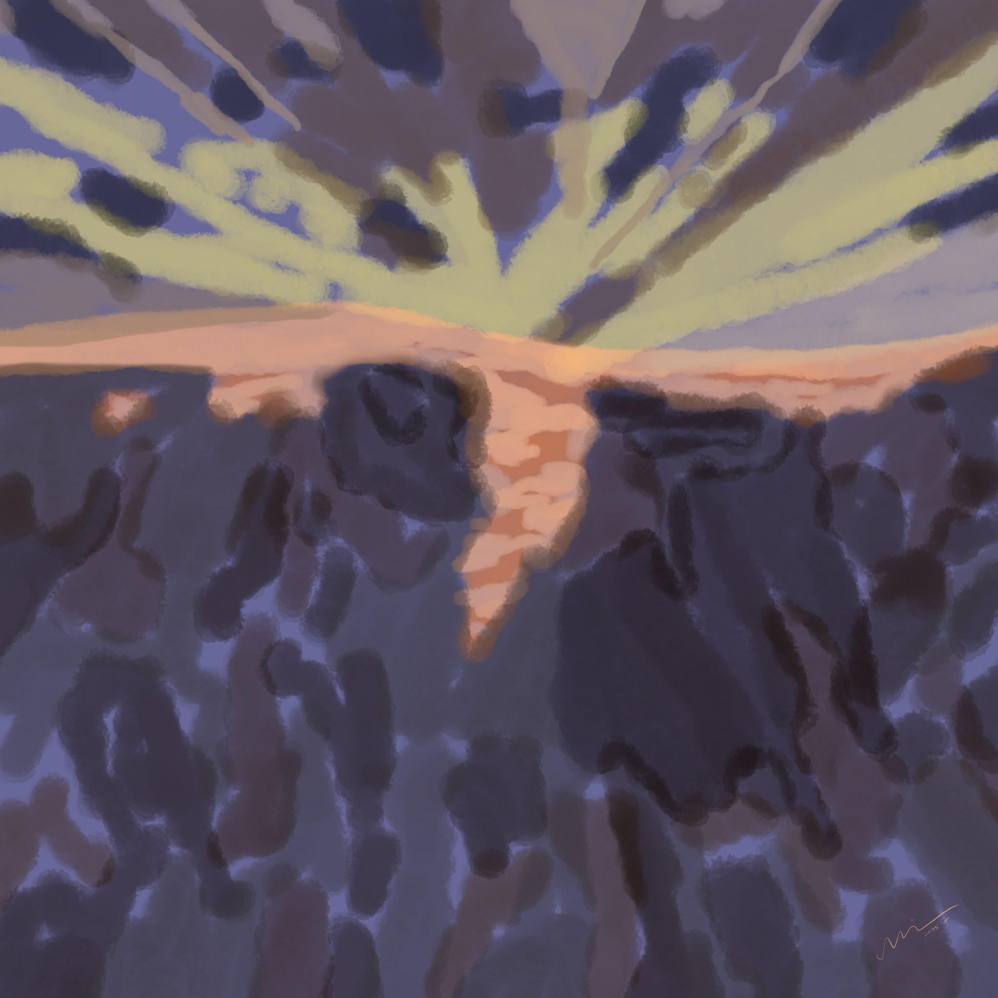 Chinese: 以抽象笔触撕裂日常的视觉惯性,将自然解构为色彩与光线的狂欢。放射状的天幕如崩解的星图,深浅交叠的滩涂似大地未干的痕迹,而那一缕红色光影,则是混沌中迸发的裂变之刃——它不依附于具象形态,却以纯粹的色彩张力刺破画面,成为视觉的焦点与精神的出口。