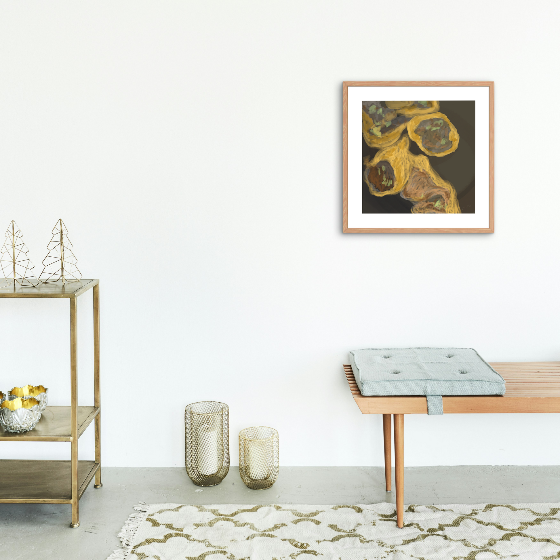 Bold strokes sketch a beloved street snack—crispy fried oysters—into lively geometry. Ink and gold collide, rendering more than food: Childhood Memory is the taste of waiting, the warmth of night markets, and the bright simplicity of being young.