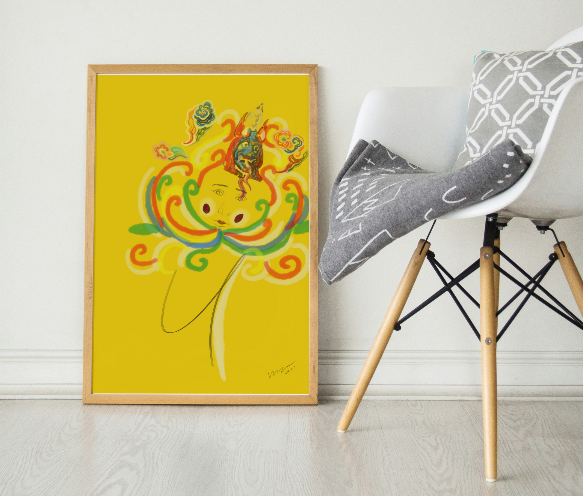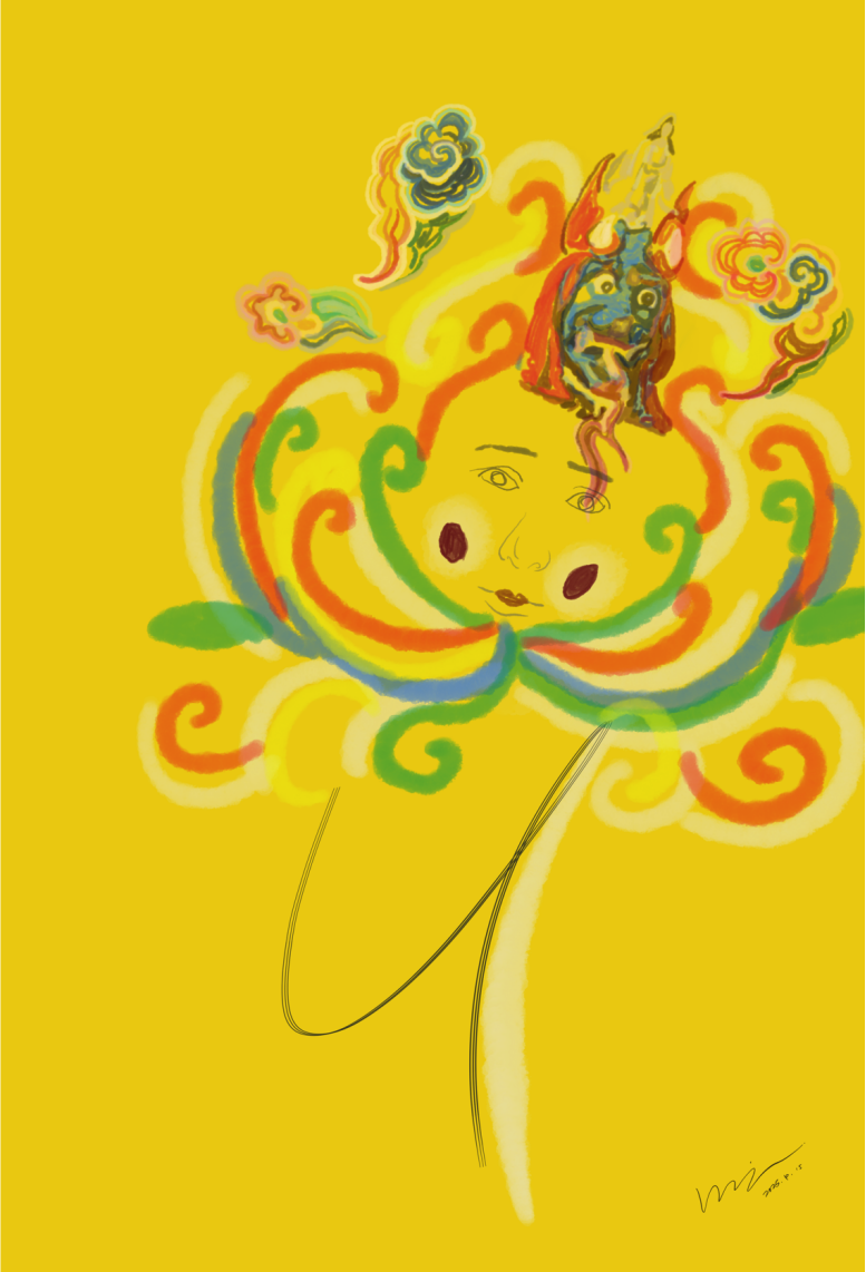 Rainbow-colored auspicious clouds spread like a dream across the sky, blending soft hues that whisper ancient Eastern tales. The intangible cultural heritage mask bears intricate patterns carved with time’s wisdom. Its double-yellow expression is humorous yet profound, reflecting diverse emotions.